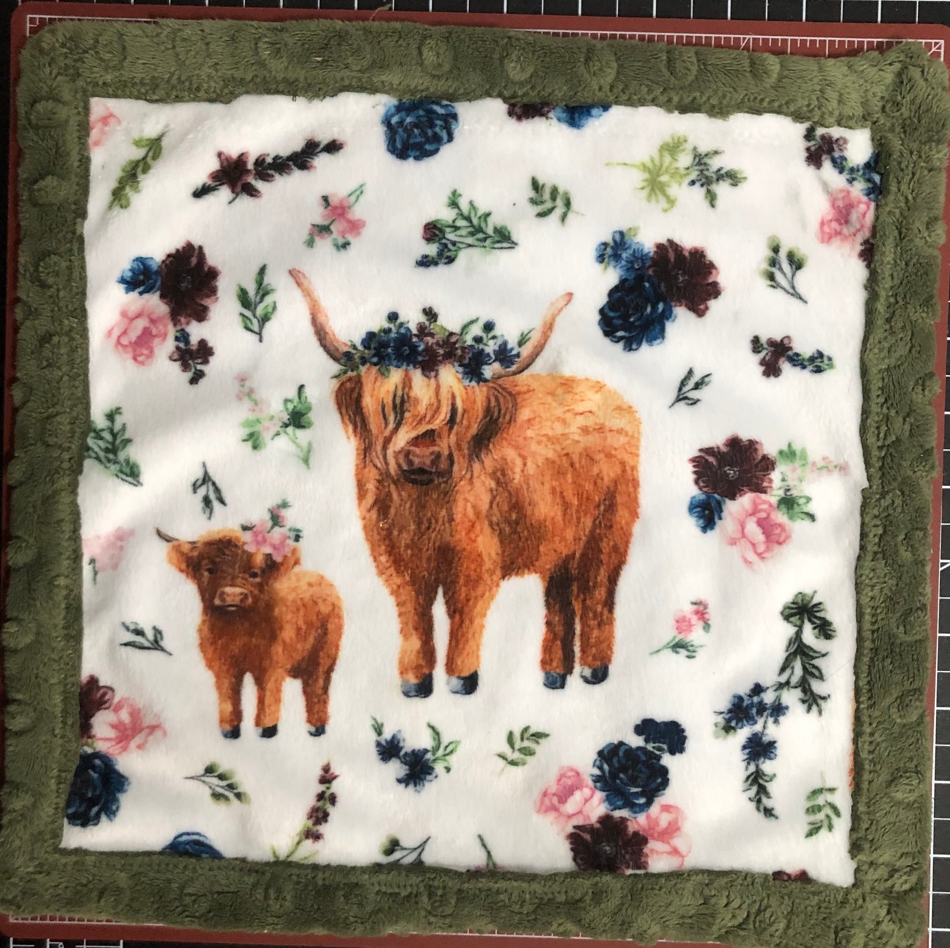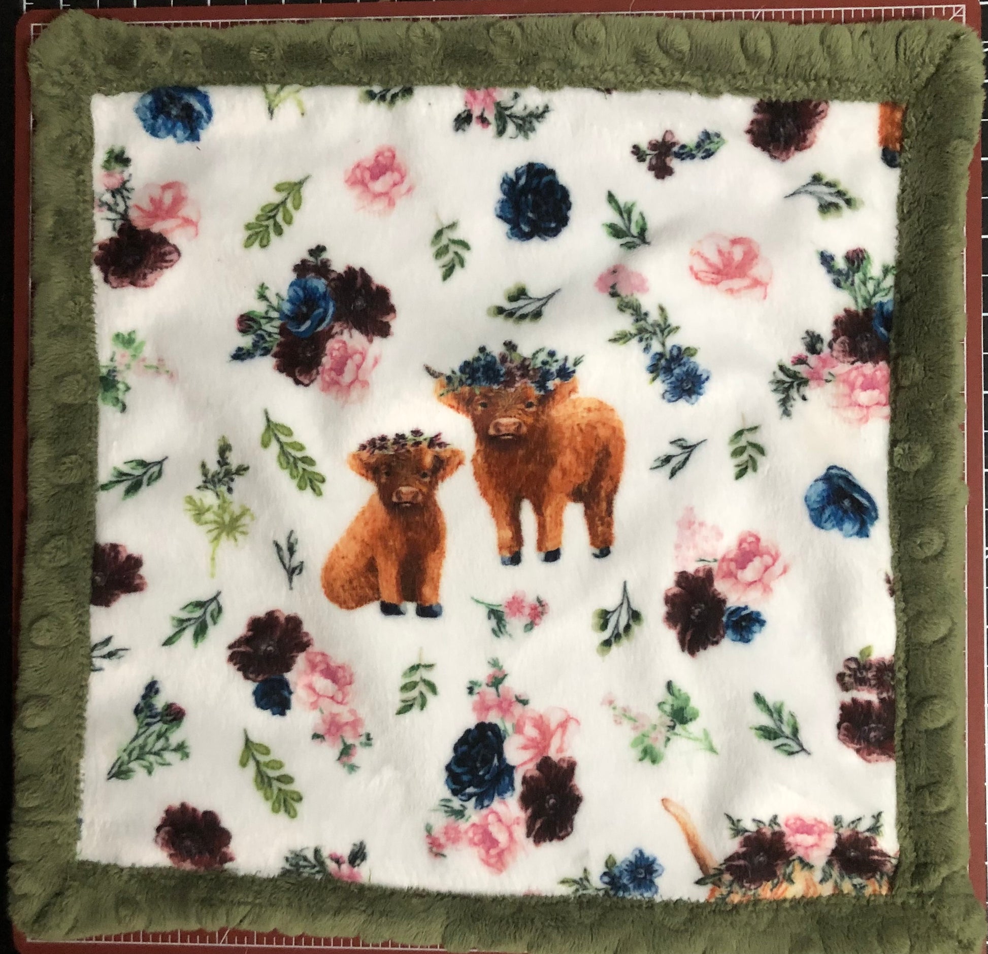 Shannon brand minky Highland Cow print, double sided lovey with green dimple binding.